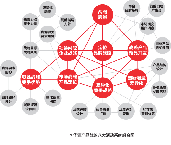 包括企業戰略,品牌戰略,文化戰略,市場戰略,業務組合,產品組合,產品結構,產品策略,產品開發,包裝設計,位置商標,色彩營銷,門頭設計,店面空間設計,品牌營銷,營銷語言等等,這些圍繞產品所展開的戰略活動系統,最終都落實為產品戰略。