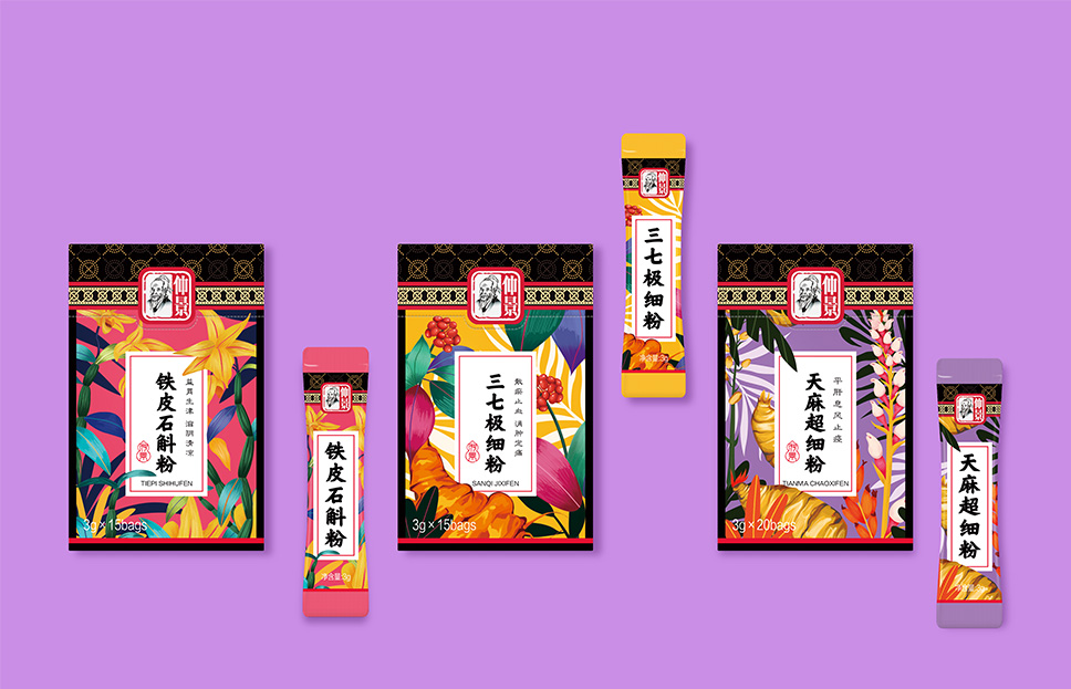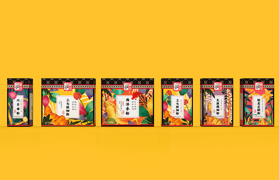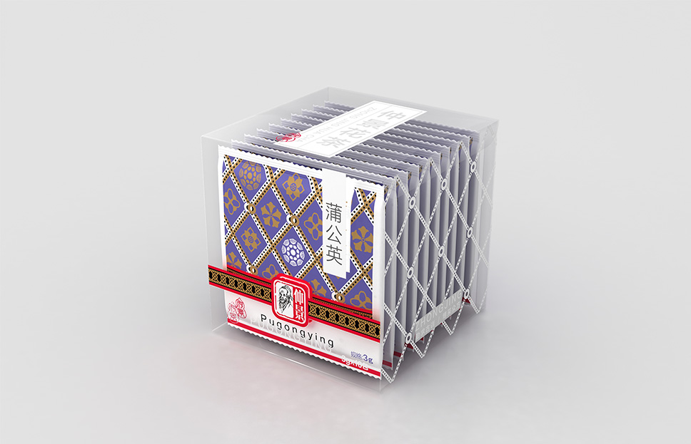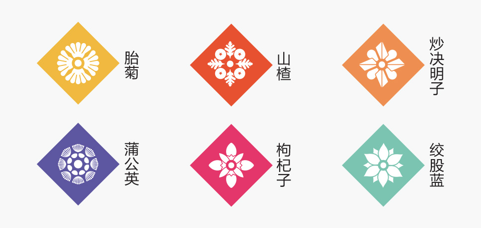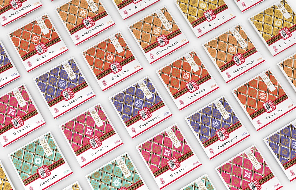 李華清項目團隊在市場走訪中看到了中醫(yī)抓方配伍的場景,由此產生了靈感的聯(lián)想。我們運用方勝紋與十字穿環(huán)紋結合衍生出抓方配伍場景凌霄花、茱萸花、柿蒂紋與產品進行搭配,實現君臣佐使,和諧配伍。通過簡單有序的元素排列,形成專屬的仲景花茶戰(zhàn)略元素。