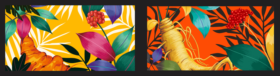 李華清項目團隊翻閱了各種文化書籍,從《聆聽漢畫》中找到了靈感,發(fā)現漢畫的風格大多都是浪漫渾樸,擴大豪放的風格,我們學習上面的繪制技巧和表現方法:畫面四周黑色邊框,猶如漢代歷史的大門,將我們帶入春天的百草園,去窺探神秘百草園的生長意境,感受撲面而來的自然芳香的本草氣息。