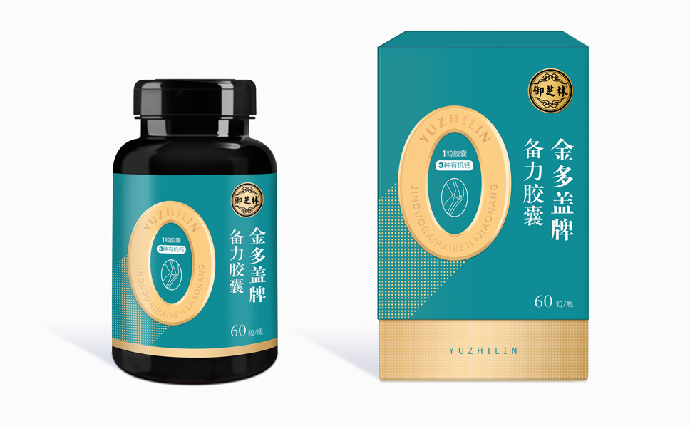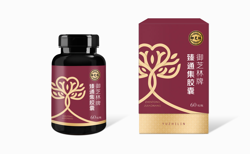 臻通集膠囊的定位人群為中老年人,具有輔助降血脂、增強免疫力的保健功能,李華清通過前期的分析,在視覺表現上運用樹、心形、頭腦、手等元素進行組合,形成臻通集膠囊戰略元素,達到視覺聚焦效果,抽象畫的圖形,用金色戰略色彩體現,更具有品質感。