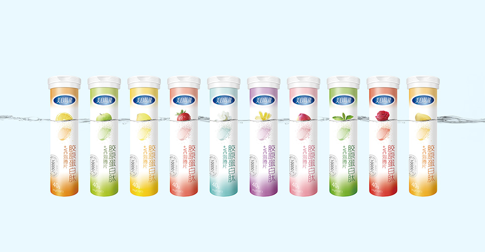 泡騰片放入水中迅速升騰起無數氣泡的一瞬間,美妙化作唯美的味道,讓身體里每個細胞迅速蘇醒,提供一天能量所需。是包裝創意的主題,讓消費者直觀的感受到產品的神奇力量,彰顯品牌的青春與活力。系列產品在終端成列中形成靚麗的視覺聚焦點,同時為后期的宣傳片拍攝提供了創意腳本。